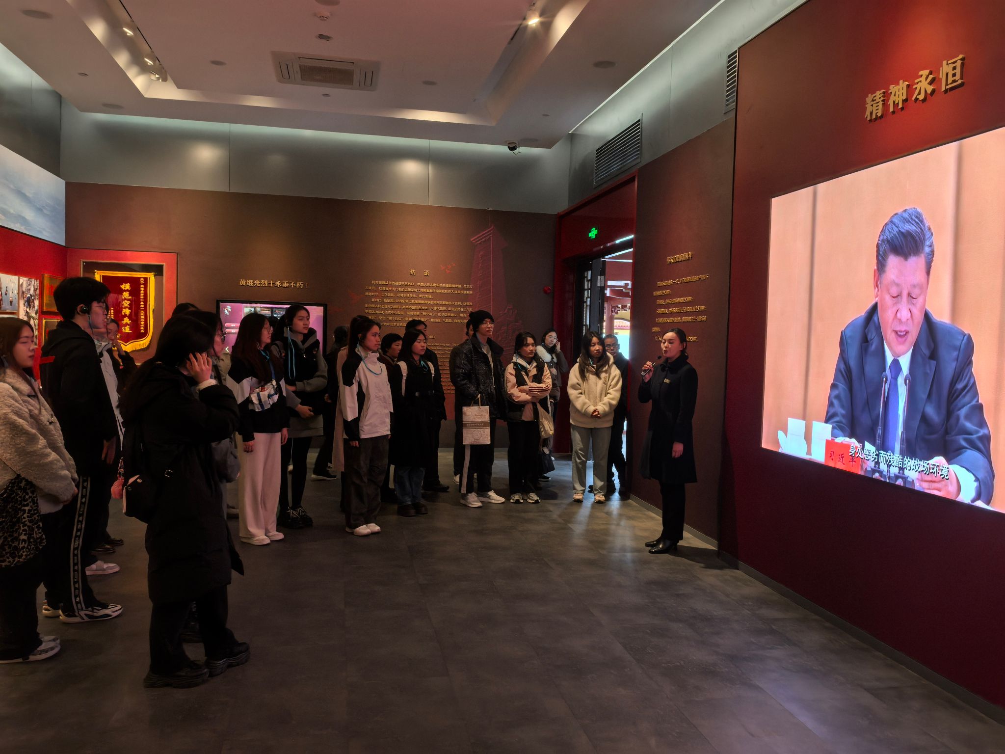 在讲解员的指引与解说下,师生们在一个小时的参观中,深入学习了特级英雄黄继光在抗美援朝战争上甘岭战役中的英勇事迹。漫步展厅之中,仿佛历史的画卷缓缓展开,战场的硝烟似乎仍在空气中弥漫。步入影播厅,光影交错间,黄继光英勇堵枪眼的历史被生动再现,在场师生无一人不动容。