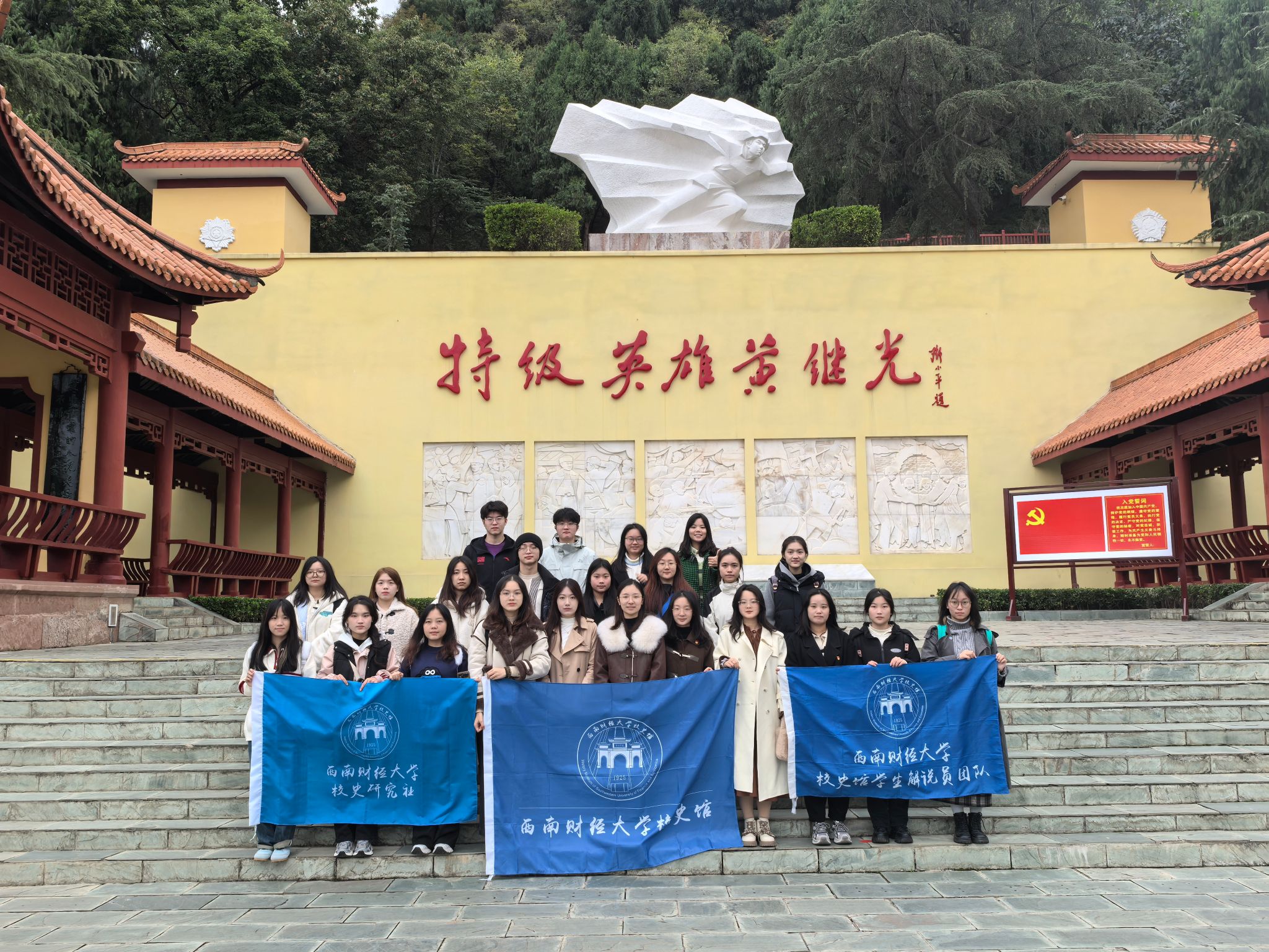 “一个有希望的民族不能没有英雄,一个有前途的国家不能没有先锋。”11月19日,档案馆、校史馆组织党支部、校史馆学生讲解团、校史研究社师生一行27人前往德阳市中江县,先后参观了黄继光纪念馆和悦来镇豹隐广场,缅怀先烈、学史育人,开展社会实践活动。