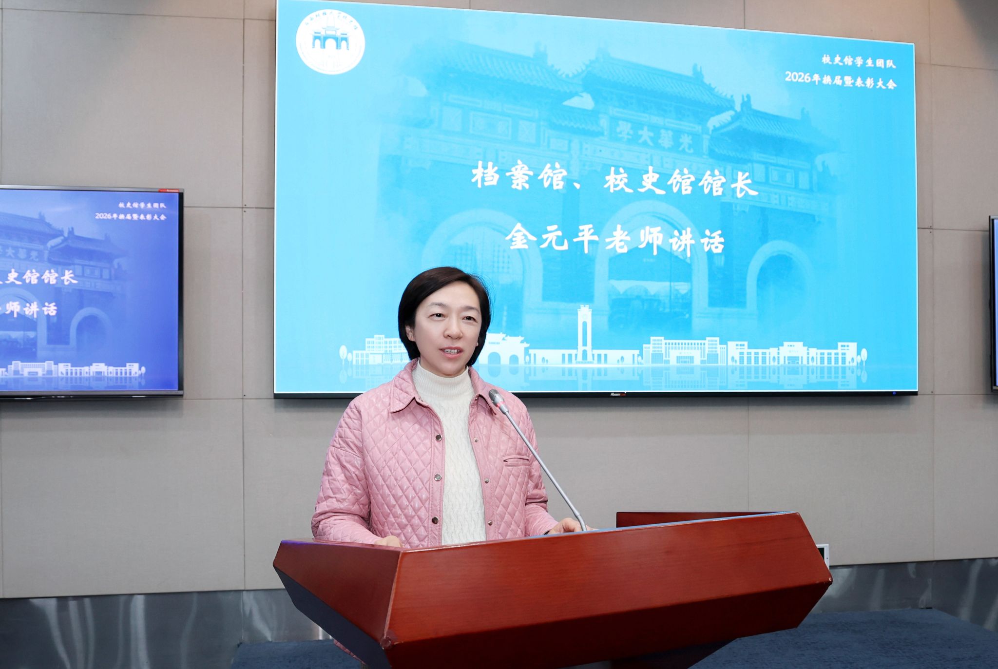 大会最后,档案馆、校史馆馆长金元平老师讲话。她充分肯定了学生团队在校史文化传播中发挥的重要作用,指出在百年校庆后的新起点上,校史馆焕新升级,学生团队更要肩负起传承与创新的双重使命。她勉励全体成员以史为鉴、薪火相传,在弘扬校史精神、服务立德树人根本任务中贡献青春力量。