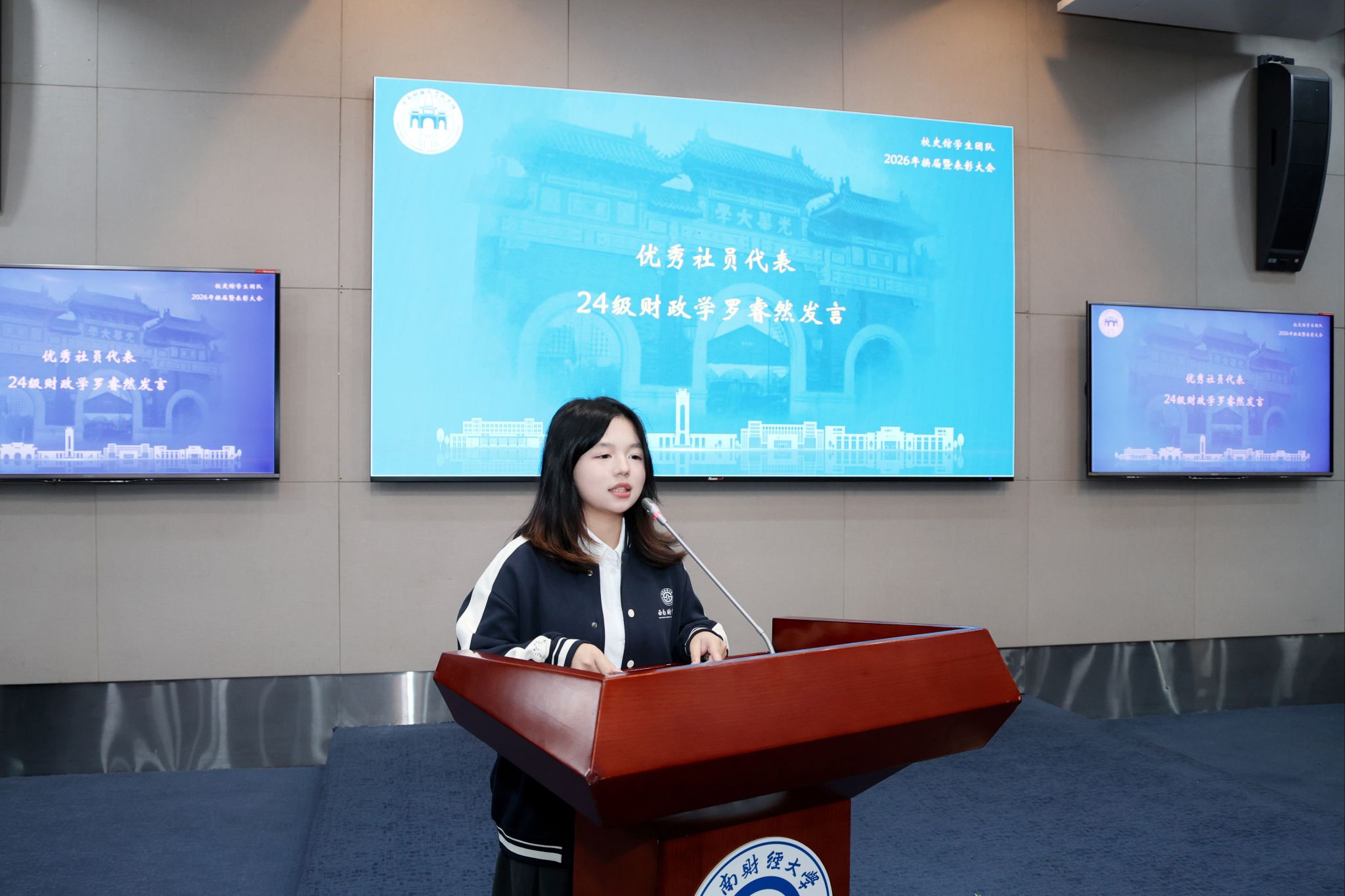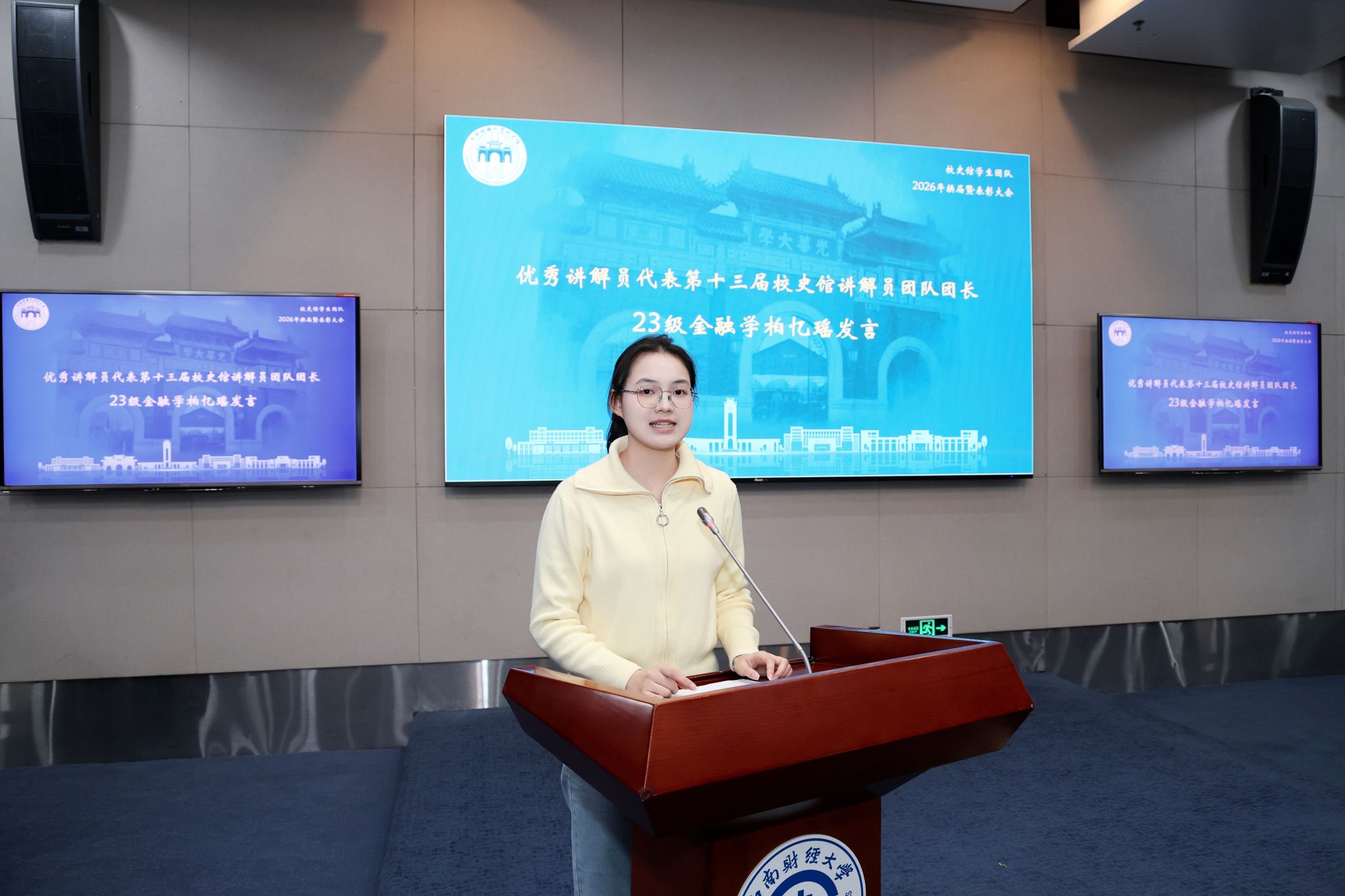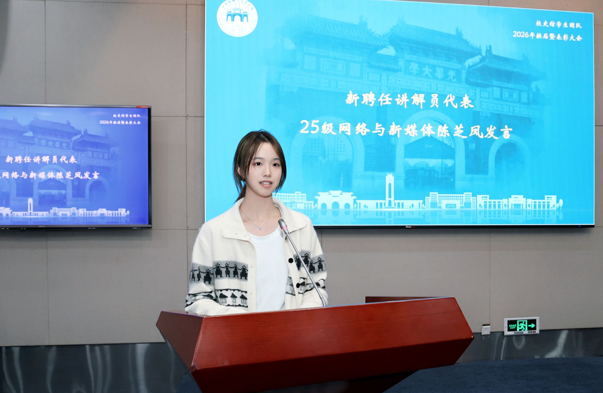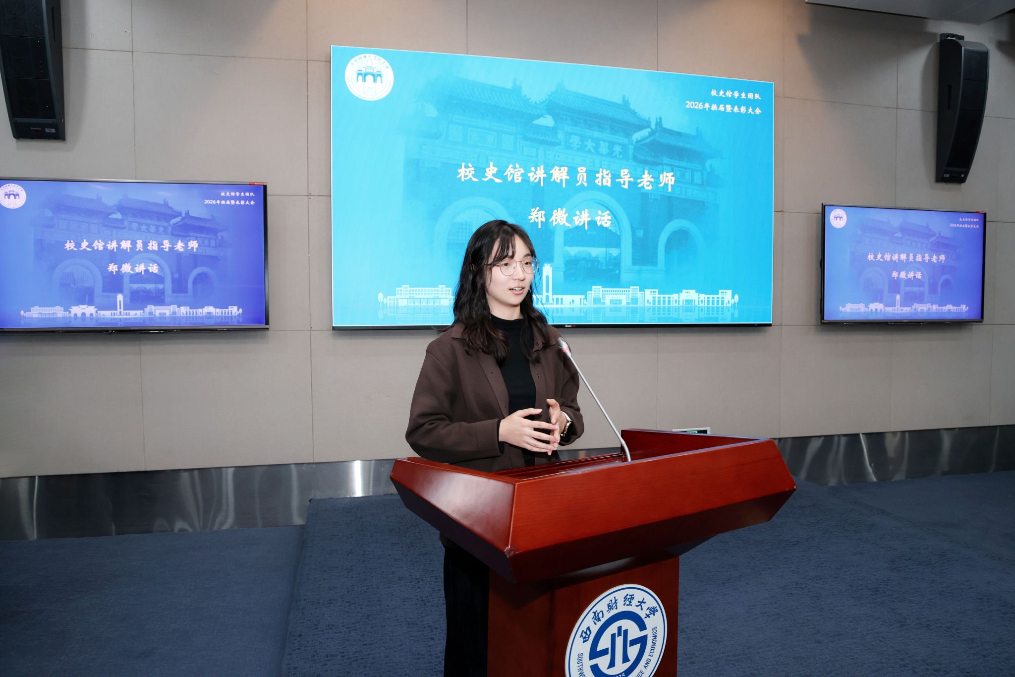 25级网络与新媒体专业陈芝凤作为新聘任讲解员代表发言,她表达了对校史讲解工作的热爱与敬畏,表示将以青春之声讲好西财故事。