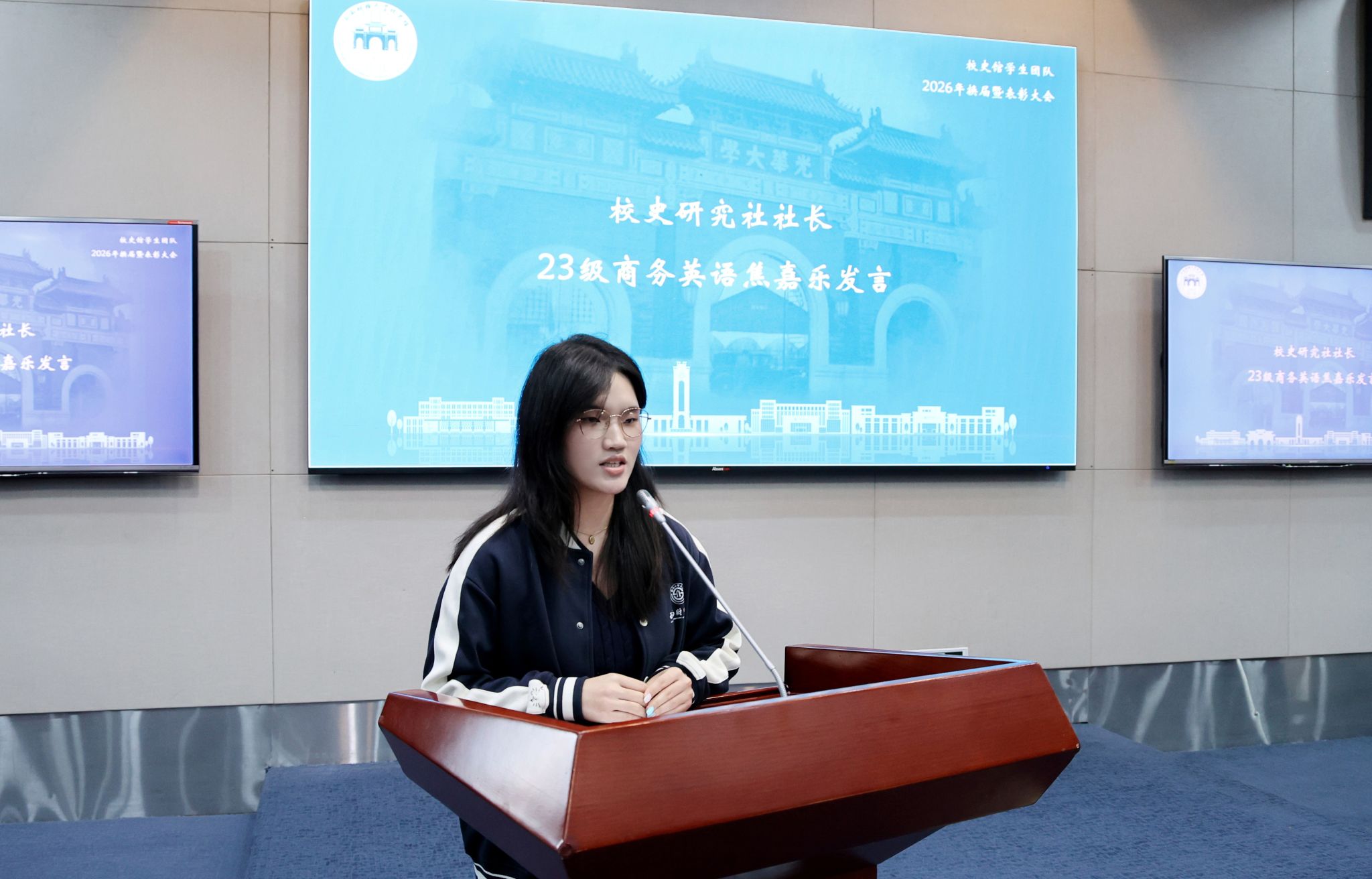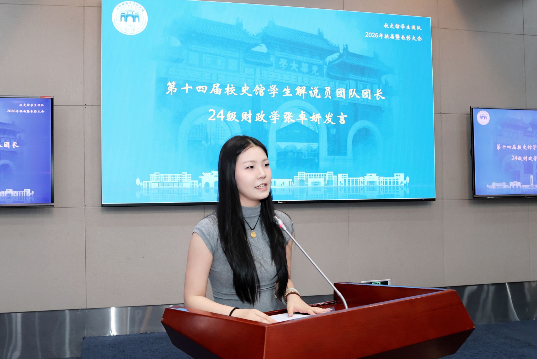 第十四届团长张卓妍在发言中表示,新一届团队将不负信任,以更饱满的热情、更专业的讲解,擦亮校史馆这张文化名片。校史研究社社长、2023级商务英语专业的焦嘉乐同学也在发言中表示,研究社将用年轻的视角去发现校史中的新亮点,用青春的热情守护学校的记忆。