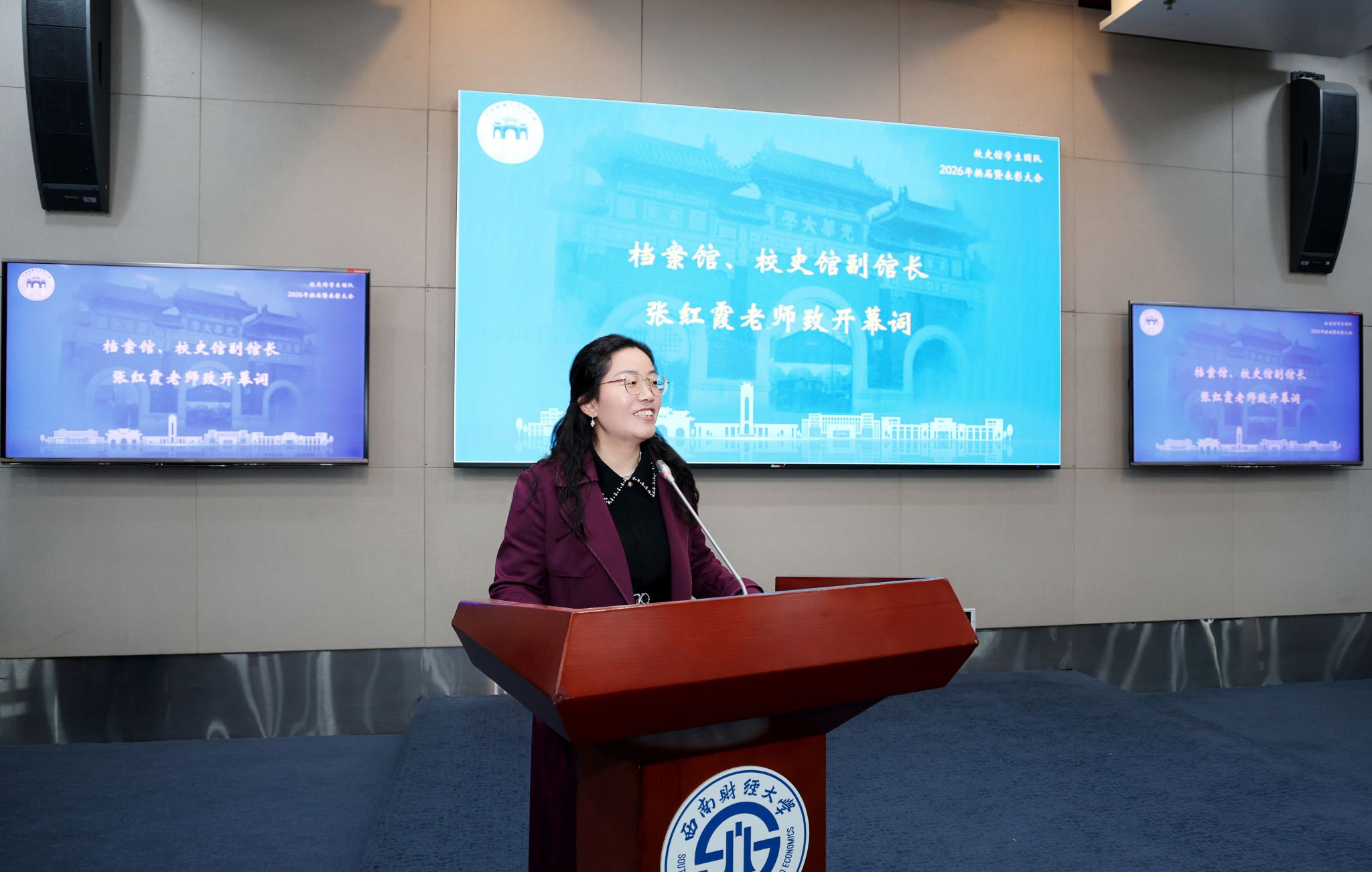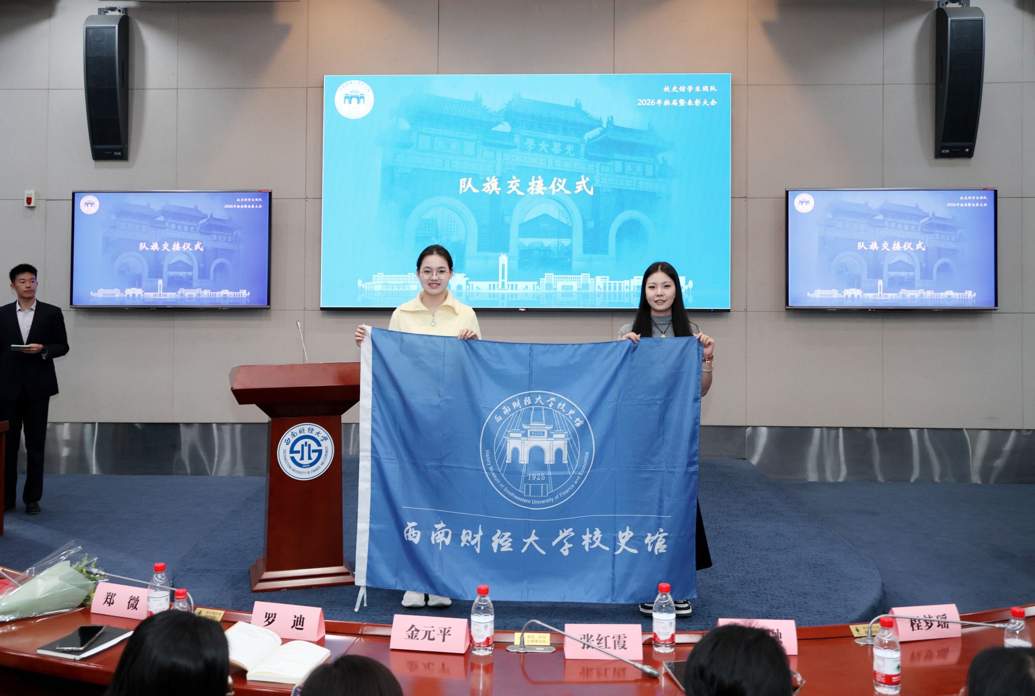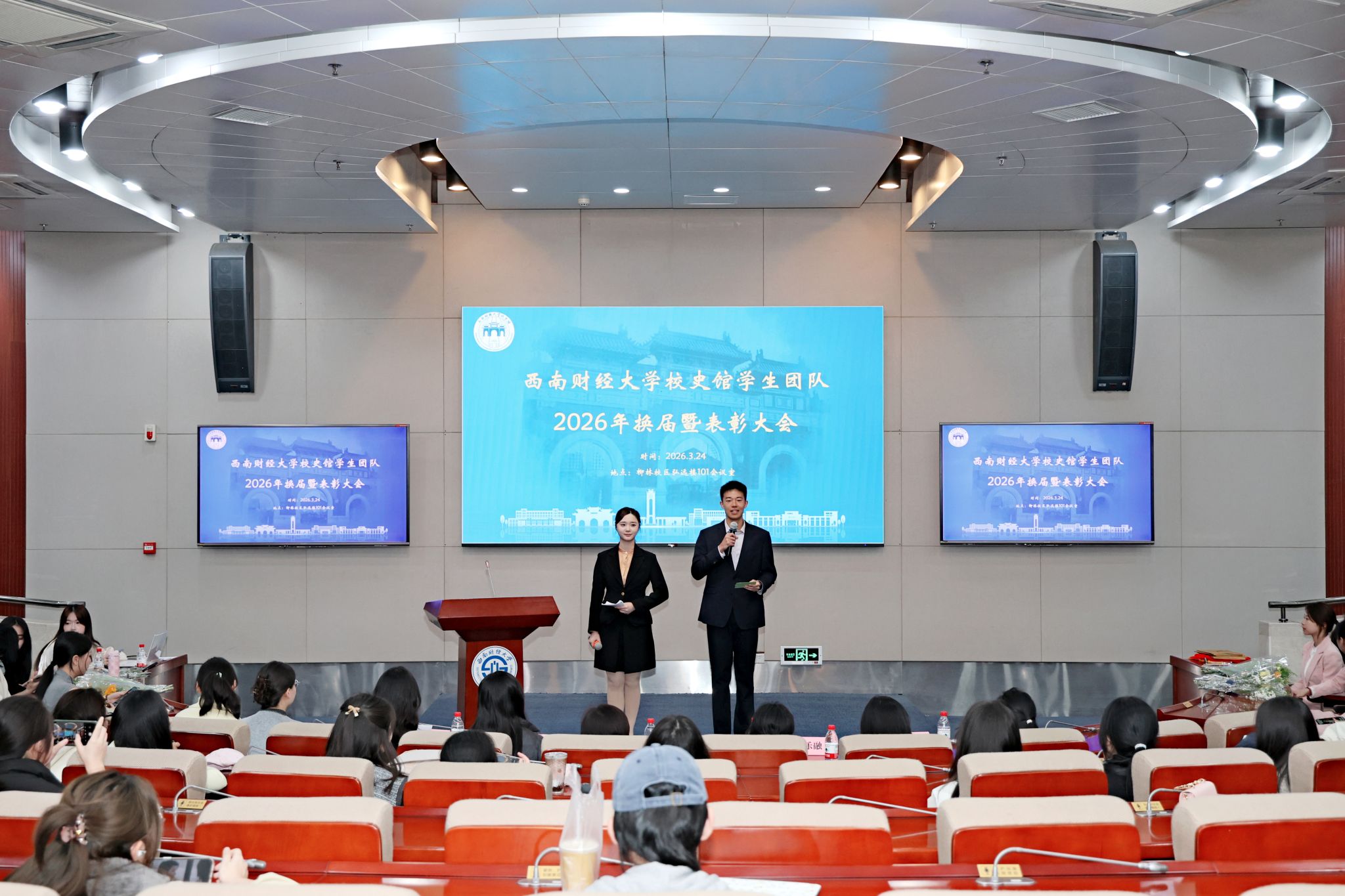 2026年3月24日下午,西南财经大学校史馆学生团队2026年换届暨表彰大会在柳林校区弘远楼101会议室举行。档案馆、校史馆馆长金元平,副馆长张红霞,校史研究科科长罗迪,校史研究科老师郑微、陈乐融、程梦瑶,以及部分22、23级中英文讲解员、全体24、25级中英文讲解员、校史研究社成员参加会议。大会由25级国际经济与贸易专业李绍辉、25级经济统计学专业刘思彤主持。